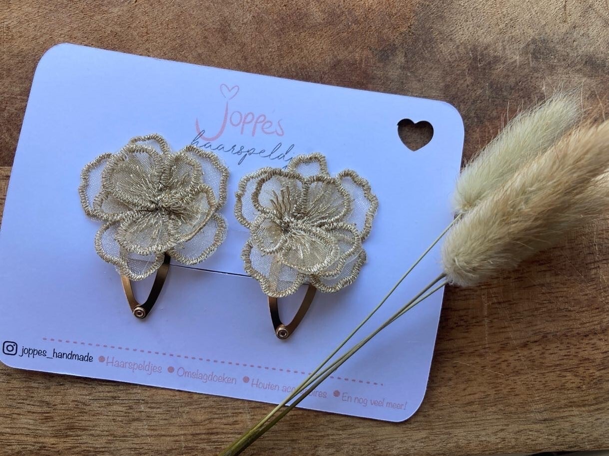 Een set van 2 gouden klik klak speldjes met daarop een bloem.De speldjes zijn 4 cm.
