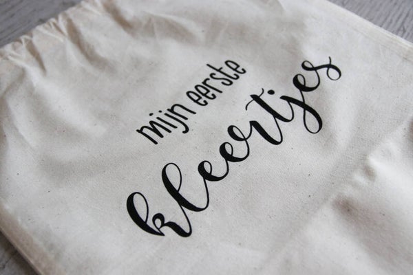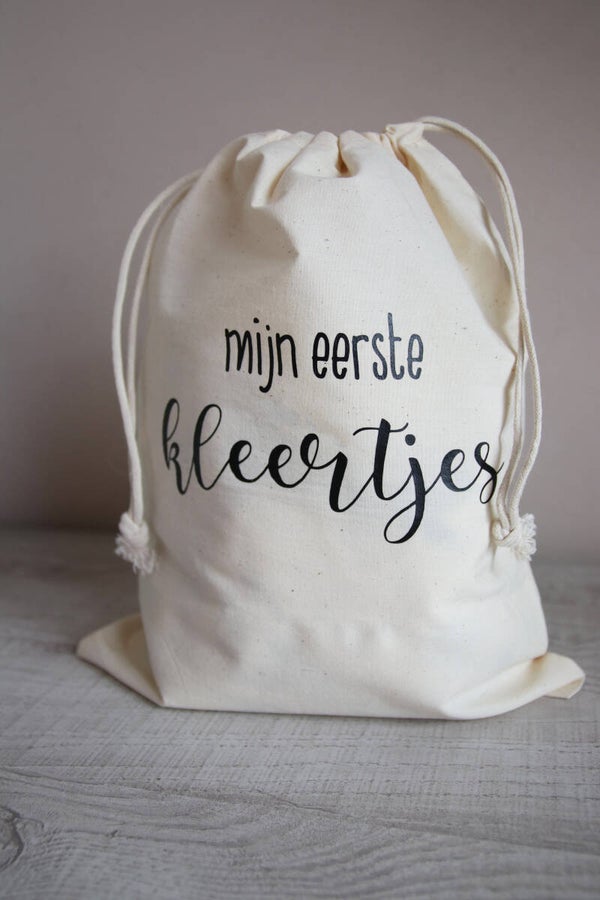 Een mooie bewaarzak van katoen voor de allereerste kleertjes, zo blijven ze nog lang mooi.