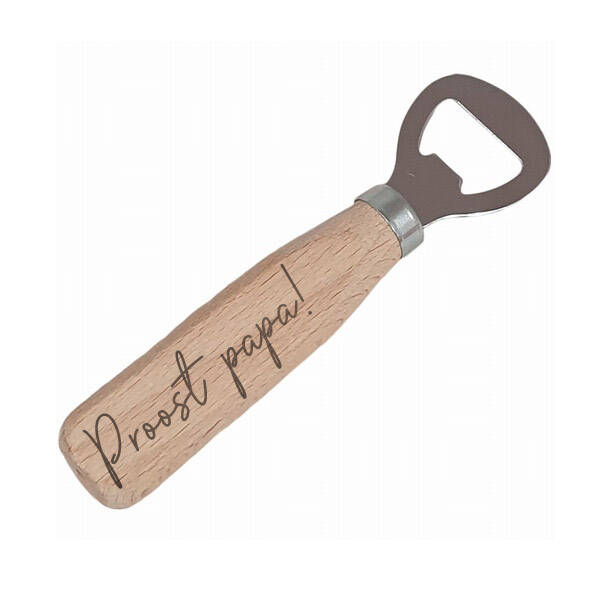 Verras jouw papa met een mooie houten flesopener.De opener is 14.5×2.5×1.9cm en gemaakt van beukenhout.Kies uit één van de twee teksten:- Liefste papa- Proost papa!